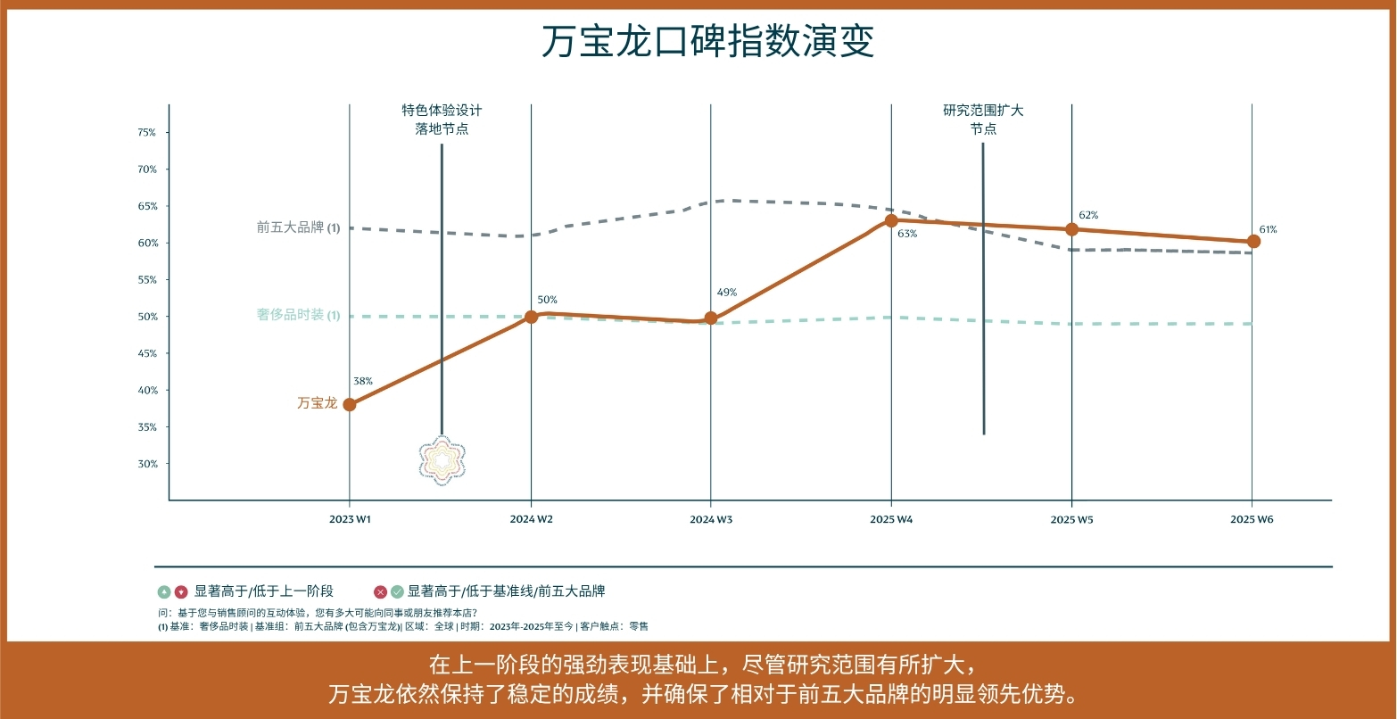 - 万宝龙的口碑指数大幅提升25个点,2025年最高曾达63%,这一水平足以比肩奢侈品时装领域的顶尖品牌。